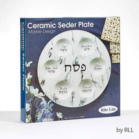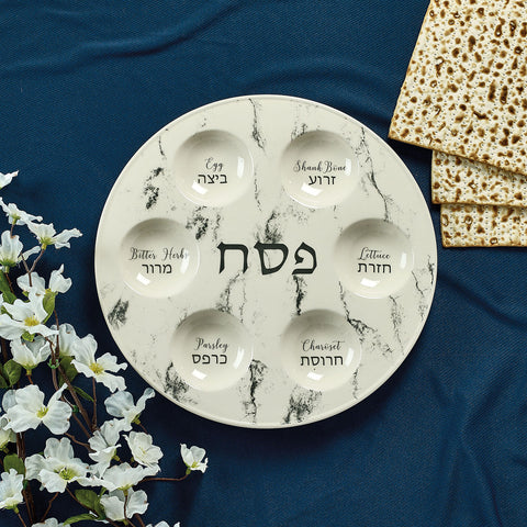 Raise your Passover table to new heights with the refined beauty of this Marble Design Ceramic Seder Plate. Featuring a timeless marble pattern, the names of the six symbolic foods are written in both English and Hebrew, bringing an elegant enhancement to your Seder experience.
